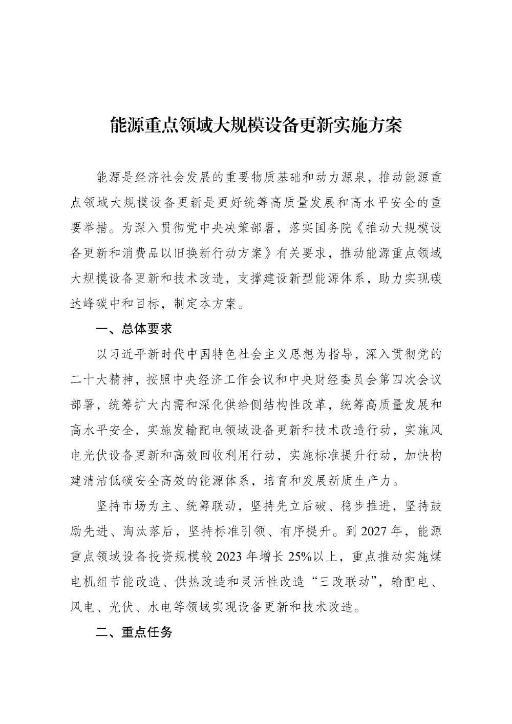 8月21日,國家發展改革委辦公廳、國家能源局綜合司發布關于印發《能源重點領域大規模設備更新實施方案》的通知。